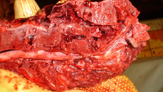 En la inspección de matadero se detectó una compresión de la médula espinal en esta canal. ¿Qué puede haber causado esta lesión?
