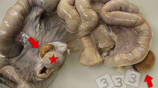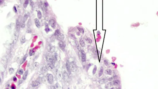 ¿Qué son los organismos (flecha) que hay dentro de la mucosa del intestino delgado de este lechón con diarrea?