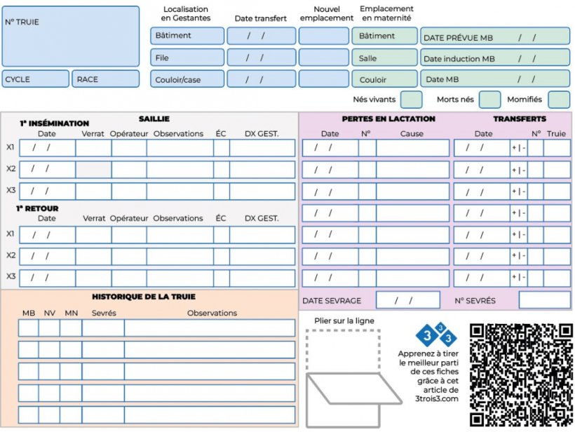 La grande majorité des programmes de gestion génèrent leurs propres fiches, mais pour les élevages qui ne travaillent pas avec ces programmes ou pour ceux qui préfèrent en avoir une différente, voici un exemple de fiche qui pourrait servir de référence.