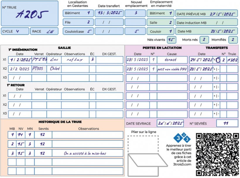 Le verso de la fiche sert à noter l'évolution de la mise bas. Des annotations précises permettent de savoir s'il est nécessaire d'intervenir lors de la mise bas. En constatant qu'au bout de 30 minutes, la truie n'a mis bas aucun porcelet et compte tenu de ses antécédents de morts-nés, le soigneur décide d'assister à la mise bas.