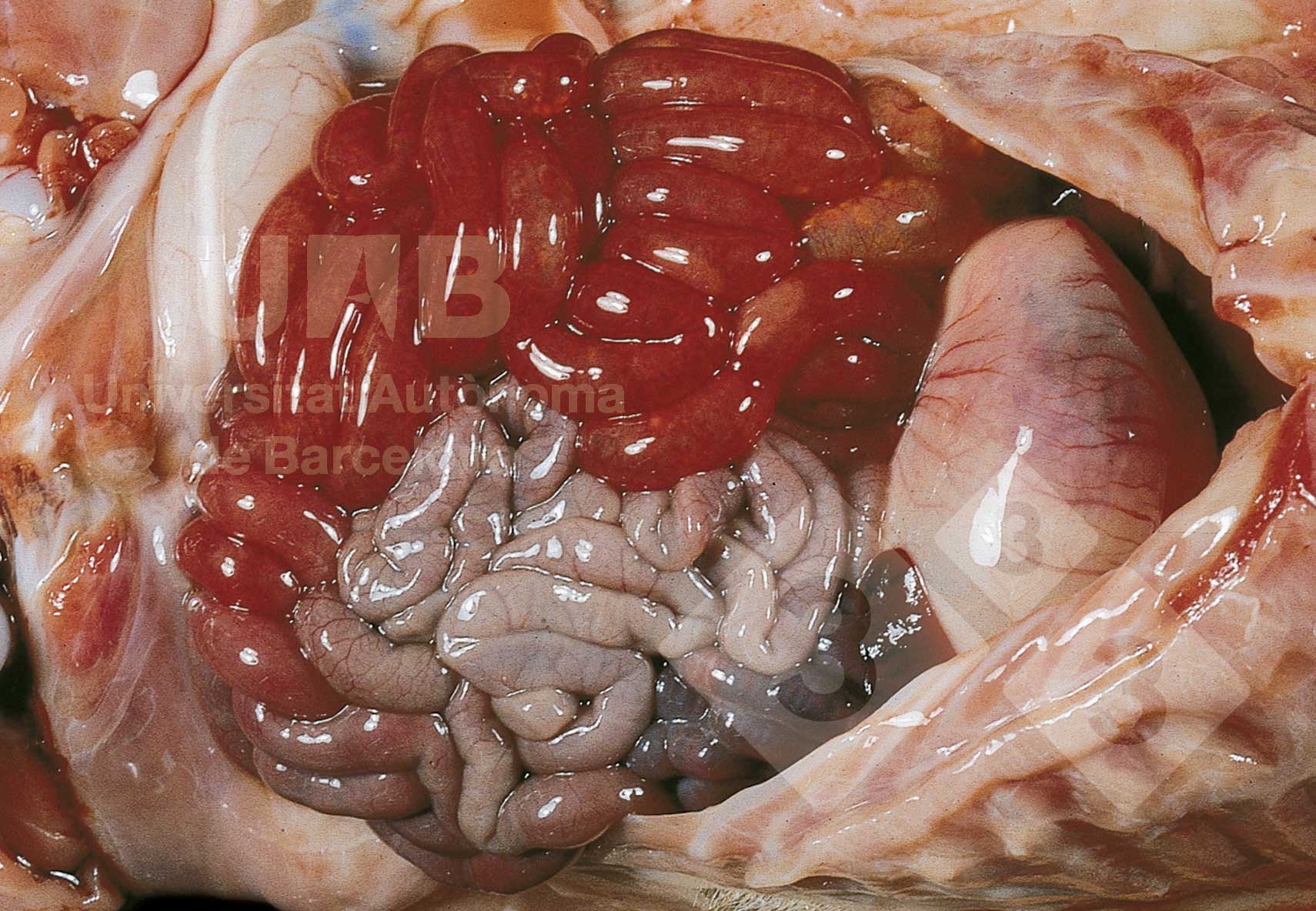 Ces anses intestinales remplies d’un contenu liquide hémorragiques sont en lien avec une infection par Clostridium perfringens de type C chez les porcelets allaitants. Certains des facteurs qui prédisposent à cette infection sont les mauvaises conditions d'hygiène, la densité excessive et des traitements antibiotiques.