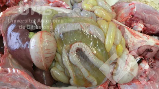 On constate une augmentation de la mortalité par mort subite chez les porcs d'engraissement. Les porcs post mortem présentent des anses intestinales distendues par des gaz, une couleur pourpre intense et sont remplis de liquide contenant beaucoup de sang.