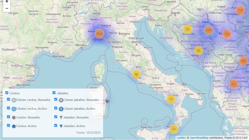 Le nord de l'Italie (Piémont, Ligurie, Lombardie, Émilie-Romagne et Toscane) reste l'épicentre initial et la zone la plus problématique. Après son introduction, le virus de la peste porcine africaine (PPA) s'est rapidement propagé parmi la population de sangliers, favorisé par la continuité de l'habitat, la forte densité et la complexité topographique. Les zones soumises à des restrictions sont passées de 1 000 km2 au départ à plus de 21 000 km2 aujourd'hui. Cette multiplication par vingt depuis 2022 montre que les mesures de confinement initiales n'ont pas eu l'effet escompté.
