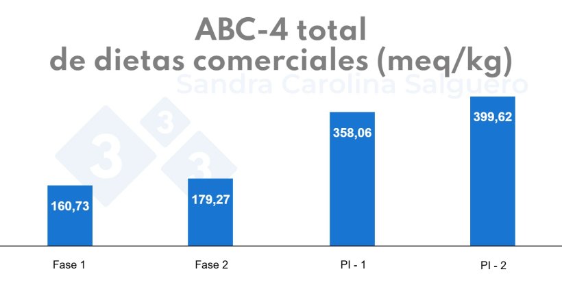 En prácticas comerciales, las primeras fases post-destete utilizan dietas con bajo ABC-4 (Fase 1 y Fase 2), aumentando gradualmente en alimentos de pre-iniciales (PI-1 y PI-2) hasta valores cercanos a 400 mEq/Kg, reflejando una adaptación al desarrollo digestivo del lechón (gráfico 1).