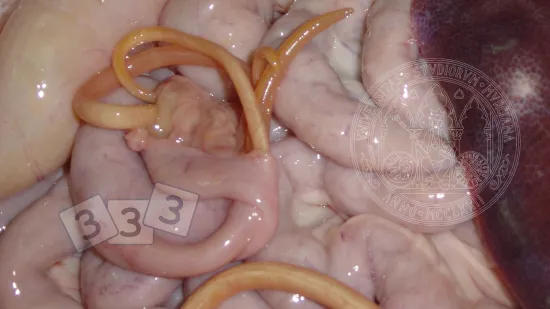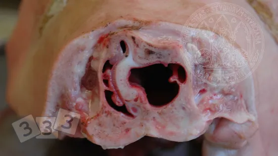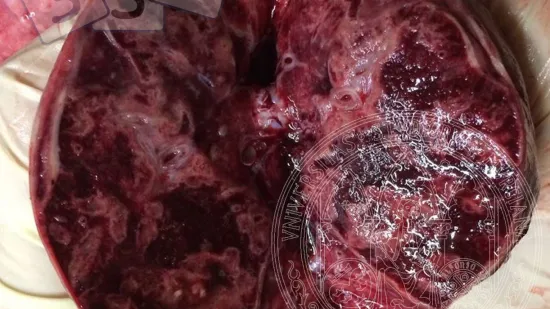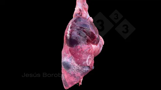 Esta imagen del corte transversal de un pulmón de cerdo es característica de una neumonía causada por: