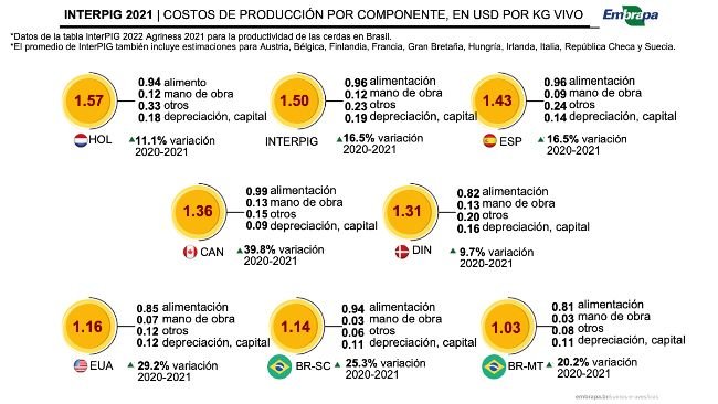 Entre los 17 países representados, Brasil sigue teniendo el menor coste de producción en dólares por kilo vivo de cerdo. En 2022, el coste de producción en el estado brasileño de Mato Grosso fue de USD1,13 /kg vivo, mientras que en Santa Catarina fue de USD 1,28. Brasil tiene costos inferiores a los de Estados Unidos (USD 1,42/kg vivo), Dinamarca (USD 1,49), España (USD 1,66), Países Bajos (USD 1,74) y Alemania (USD 1,83).